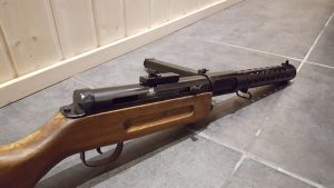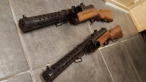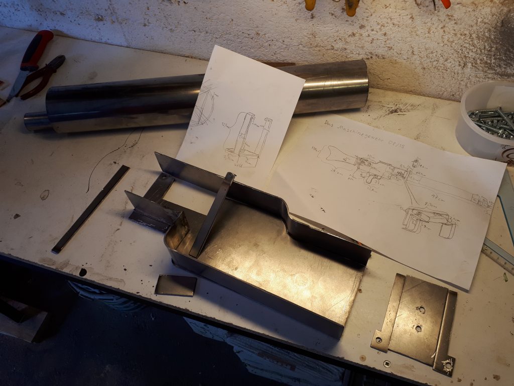 Starting in 26th of July, 2017 with a cardboard prototype and some metal plate I decided to build myself an Mg08/15 because no one produced them as airsoft guns. In the photo you see the prototype and the barrel of the gun along with paper plans.