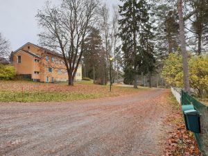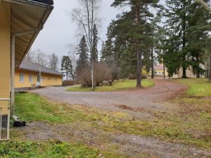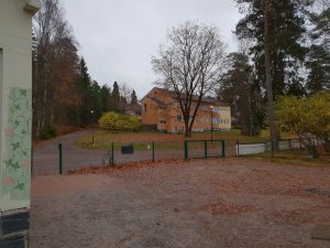 Päiväkodin pihan vierestä näkymä alueen keskelle ohi rakennuksen E.